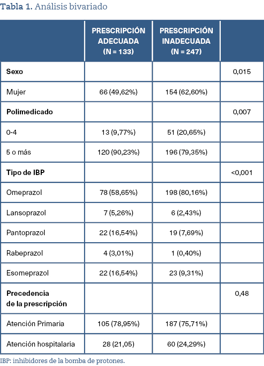 Resultados: se incluyeron 380 pacientes (media edad: 69,7; desviación estándar [DE]: 14,05 años; 58,15% mujeres; 83,15% polimedicados). La prescripción crónica inadecuada de IBP fue del 65% (intervalo de confianza [IC] 95%: 60,0-69,6%). La principal causa de inadecuación fue una indicación incorrecta (81,8%), seguida de temporalidad inadecuada (18,2%). En el análisis multivariado, el sexo femenino se asoció significativamente a mayor riesgo de prescripción inadecuada (odds ratio [OR]: 1,73; IC 95%: 1,10-2,71; p = 0,018), mientras que la polimedicación tuvo un efecto protector (OR: 0,45; IC 95%: 0,23-0,88; p = 0,021). El omeprazol presentó mayor probabilidad de inadecuación respecto a otros IBP (p <0,001). El origen de la prescripción no se asoció de forma significativa con la inadecuación (p = 0,204).