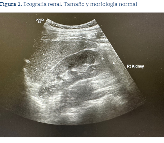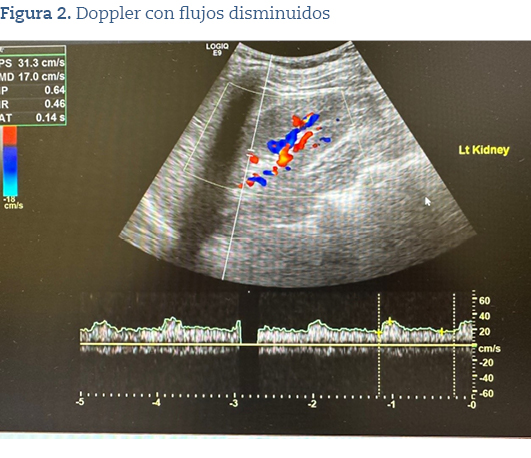 En la ecografía, se objetivó tamaño de ambos riñones normales sin presencia de quistes o nódulos (figura 1), pero en el Doppler (figura 2) se apreciaban flujos disminuidos en ambos riñones.