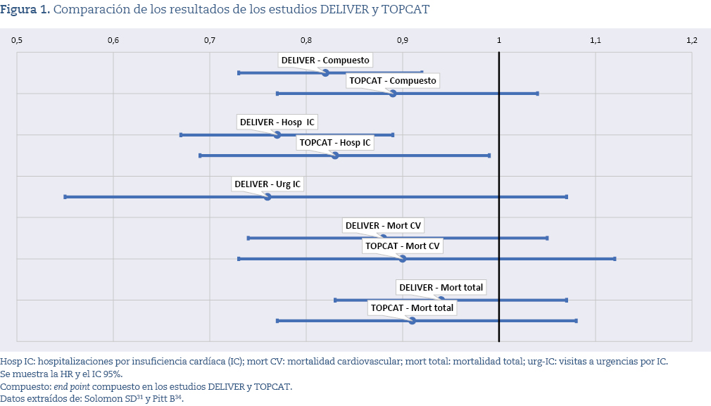 El ensayo TOPCAT34, aleatorizado y doble ciego, incluyó 3.445 pacientes con ICFEp (fracción de eyección del ventrículo izquierdo [FEVI] ≥45%) tratados con espironolactona o placebo durante una media de 3,3 años. El objetivo primario —muerte cardiovascular, paro cardíaco revertido u hospitalización por insuficiencia cardíaca— no alcanzó significación estadística (HR: 0,89; p = 0,14). Sí se observó una reducción modesta pero estadísticamente significativa en las hospitalizaciones por insuficiencia cardíaca, mientras que no hubo diferencias en mortalidad total ni en hospitalizaciones globales. En conjunto, los resultados individuales son menos distintos de los de DELIVER de lo que podría suponerse, como se muestra en la figura 1.