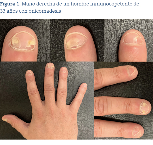 Hombre de 33 años, sin alergias conocidas y con antecedentes de hipertensión arterial, acude a consulta de Atención Primaria por fragilidad ungueal con despegamiento de 8 uñas de las manos. Diagnosticado en los 45 días previos de la EMPB, producida por el virus Coxsackie, tras contacto con su sobrina enferma.
