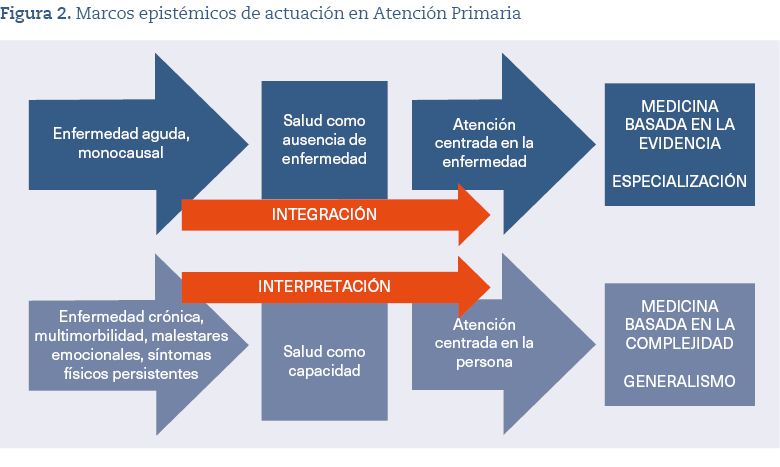 Cada uno de estos marcos epistémicos propone una forma distinta de comprender la enfermedad, la salud y el cuidado, y plantea al conjunto de profesionales de AP desafíos específicos. En el marco superior, se requiere integrar el conocimiento biomédico en el contexto particular de la persona; en el inferior, interpretar los síntomas desde una perspectiva relacional y biográfica. Cuando se trata de enfermedades agudas, bien definidas y con una causa clara, el objetivo es utilizar el conocimiento biomédico —derivado de la MBE y la especialización— dentro del contexto vital y clínico de la persona. La tarea principal es asegurar que las evidencias se usen de forma adecuada, cuidadosa y pertinente a cada situación individual, considerando elementos que, por ejemplo, puedan influir en la adherencia o que supongan un riesgo de efectos secundarios por interacciones farmacológicas.