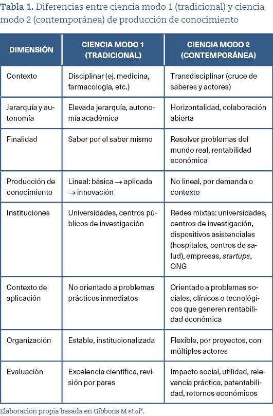 Las razones de esta situación son políticas7. El cambio fundamental se produjo en la década de los años ochenta del pasado siglo. La llamada revolución neoliberal protagonizada por Reagan y Thatcher tuvo su correlato en los procesos de producción del conocimiento científico en lo que Echeverría llama «revolución tecno-científica»8, y Gibbons et al.9, «ciencia modo 2» (tabla 1).