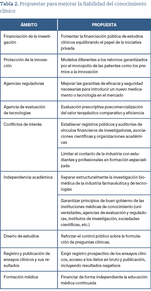 Si el origen es político, las soluciones también deben serlo. Recientemente, un grupo de destacados investigadores11 proponían algunas soluciones. Alianzas entre organizaciones profesionales y de la sociedad civil como No Es Sano12, hacen abogacía por cambiar el modelo de innovación y financiación de los medicamentos y tecnologías (tabla 2).