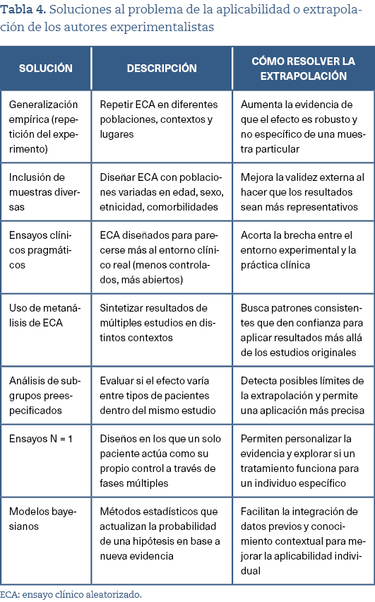 Howick reconoce el problema de la aplicabilidad de los resultados de los ECA a los contextos particulares, pero defiende que otros modelos de extrapolación están sometidos a más sesgos como el de confirmación, la ilusión de causalidad o los errores sistemáticos17. Ioannidis advierte contra la inferencia no justificada y llama a una mayor transparencia, replicación y análisis de subgrupos para mejorar la aplicabilidad de la evidencia18. En la tabla 4 podemos ver algunas soluciones por parte de los investigadores que con matices defienden el marco jerárquico de la MBE y que Julian Reiss denomina «experimentalistas»19.