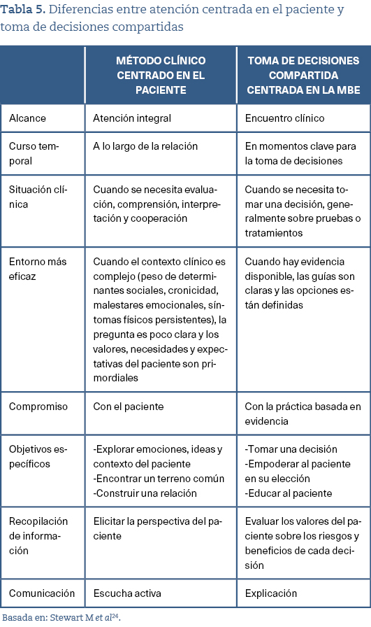 Las sucesivas conceptualizaciones de la MBE han incorporado, al menos en el plano teórico, elementos como el juicio profesional, las circunstancias clínicas particulares de los pacientes, sus valores, preferencias y consideraciones económicas, como variables a considerar en la toma de decisiones20. La llamada «toma de decisiones compartida»21-23 que se ha desarrollado desde el marco de la MBE, es útil cuando existen opciones claramente definidas y evidencia robusta, es decir, en contextos donde los objetivos están centrados en una enfermedad específica y en decisiones puntuales sobre pruebas o tratamientos. Sin embargo, cuando las decisiones clínicas son más complejas o inciertas, el modelo no proporciona orientaciones sobre cómo integrar de manera equilibrada los valores, experiencias y contexto del paciente con las evidencias. En la tabla 5 podemos ver las diferencias entre un modelo de toma de decisiones centrado en el paciente y otro de toma compartida de las decisiones centrado en las evidencias24. La consecuencia es que, en la mayoría de las circunstancias, la evidencia tiende a prevalecer sobre los demás factores.