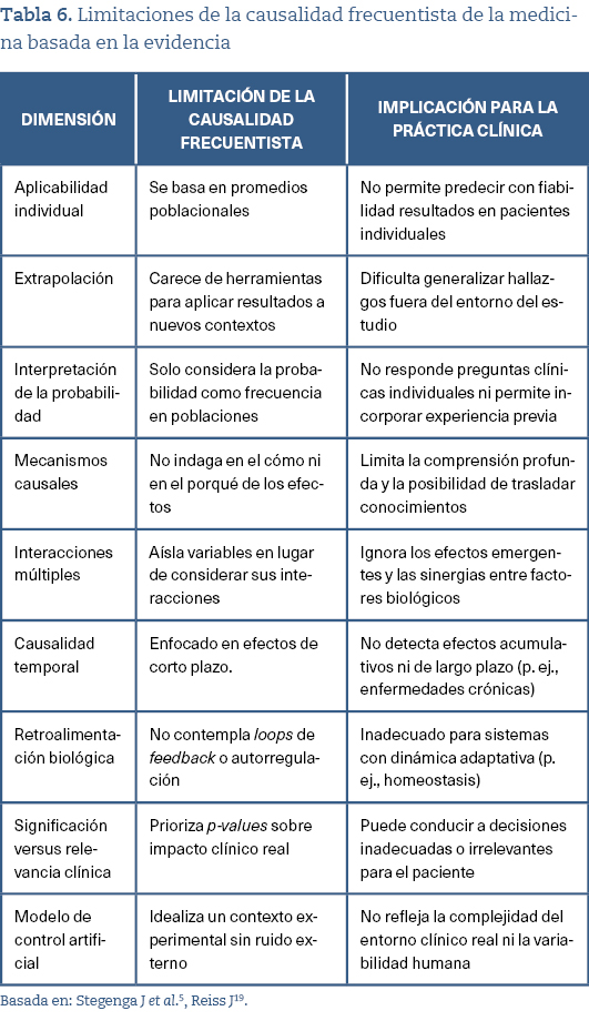 El modelo clínico propuesto por la MBE no ofrece un marco realista ni estructurado para la integración efectiva de los otros elementos del juicio, operando más como una forma encubierta de prescripción normativa20. Lejos de favorecer el razonamiento clínico, la MBE tiende a perpetuar una práctica centrada en el profesional sustentada por una evidencia estandarizada, sin contemplar de forma adecuada la complejidad inherente al proceso de toma de decisiones clínicas especialmente en condiciones de máxima incertidumbre (falta de diagnóstico claro, evidencias inexistentes, contradictorias o no robustas, pacientes con enfermedades crónicas o pluripatología, síntomas físicos persistentes, malestares emocionales, intervenciones preventivas de base individual, etc.)25. Entre las razones de estas limitaciones, se encuentra el marco frecuentista de causalidad que propone la MBE, incapaz de captar la complejidad no lineal y multifactorial de los procesos biológicos5,19 (tabla 6).