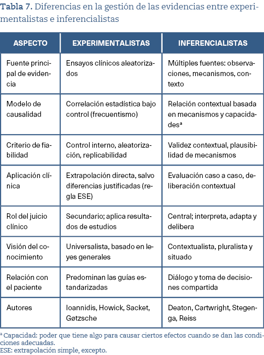 El modelo evidencial defendido por autores como Cartwright, Deaton, Reiss o Stegenga —de carácter pluralista y complejo— se ajusta de manera más adecuada a la realidad clínica al partir de una concepción contextual, flexible y deliberativa del conocimiento. Este enfoque refleja con mayor fidelidad las condiciones en las que los profesionales de la salud toman decisiones en la práctica30-32. En contraste con la rigidez de la jerarquía tradicional de las evidencias, esta propuesta permite: (1) movilizar diversas fuentes de conocimiento en función del problema clínico y de las circunstancias específicas, superando la desconexión entre rigor metodológico y pertinencia práctica; (2) reconocer el juicio clínico como un componente esencial para interpretar y aplicar la evidencia, especialmente en contextos de incertidumbre o cuando los datos disponibles entran en tensión con las particularidades del paciente; (3) incorporar la complejidad y heterogeneidad de los pacientes reales, quienes a menudo presentan múltiples comorbilidades, están influidos por determinantes sociales y manifiestan preferencias individuales, y (4) asumir de manera explícita la incertidumbre inherente a la práctica médica. A los defensores de esta visión epistémica se les ha denominado inferencialistas19. En la tabla 7 se resumen las principales diferencias entre el enfoque experimentalista y el inferencialista.