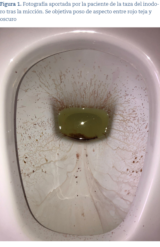 - Tras otros 5 días, presenta un nuevo episodio de orina marronácea-anaranjada y poso sobre taza del inodoro (figura 1). Acude al PAC y se realiza tira reactiva (sangre ++++, cuerpos cetónicos ++++, proteínas ++++). Es derivada al servicio de urgencias hospitalario (SUH), donde se realiza anormales y sedimento con presencia de hematíes 250/µl y 10-25 hematíes por campo.