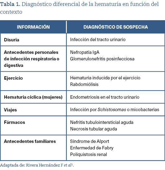 La hematuria se define como la presencia de hematíes en la orina. Se distingue entre microhematuria (aspecto normal) y macrohematuria (el color puede variar entre rojo y marrón oscuro). El abordaje diagnóstico-etiológico depende de diversos factores (tabla 1)1.