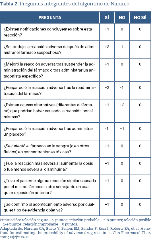 Es importante el proceso de identificación de eventos adversos de los fármacos, con lo que cobra importancia el algoritmo de Naranjo (tabla 2). Se debe tener en cuenta la asociación temporal y hay que basarse en estrategias que aporten evidencia y refuercen la sospecha. También debe evaluarse la respuesta clínica tras la retirada del mismo10.