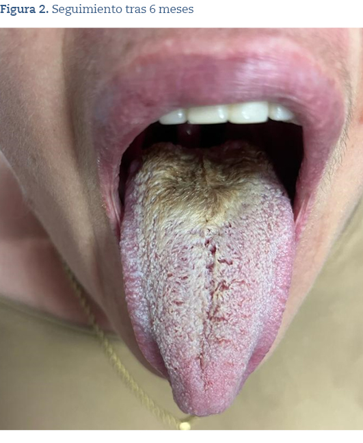 Bajo la impresión diagnóstica de leucoplasia oral vellosa al descartar otros diagnósticos diferenciales, se enfoca el tratamiento en promover una adecuada higiene oral, reducir el consumo de tabaco y hacer enjuagues bucales con clorhexidina al 0,12%, con controles periódicos. Después de 6 meses de tratamiento, la paciente acude a revisión (figura 2) y se observa una disminución en el tamaño de la placa, así como una reducción del color pardo en comparación con la fotografía tomada en la primera consulta. La paciente también informa de la desaparición de la sensación de disgeusia y de una disminución de la halitosis que presentaba.