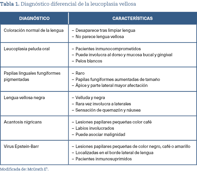 La leucoplasia oral vellosa se caracteriza por una coloración oscura en la lengua debido a la hipertrofia de las papilas filiformes6. Se han descrito casos secundarios a colonización por levaduras, siendo Candida albicans la levadura más comúnmente involucrada. El diagnóstico se establece sobre todo en base a la clínica, siendo poco común que se requieran exámenes complementarios. El diagnóstico diferencial (tabla 1) abarca diversas enfermedades, como acantosis nigricans, nevus y máculas melanocíticas de la lengua4.