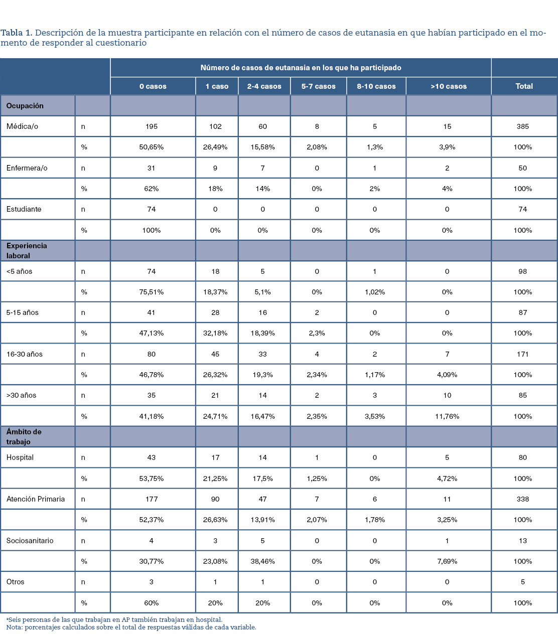 Entre los/las médicos/as de AP (n = 387), el 41,7% no había participado en ningún caso de eutanasia; el 21,5%, en un caso; el 10,3%, en 2-4 casos, y el resto, en 5 o más (tabla 1).