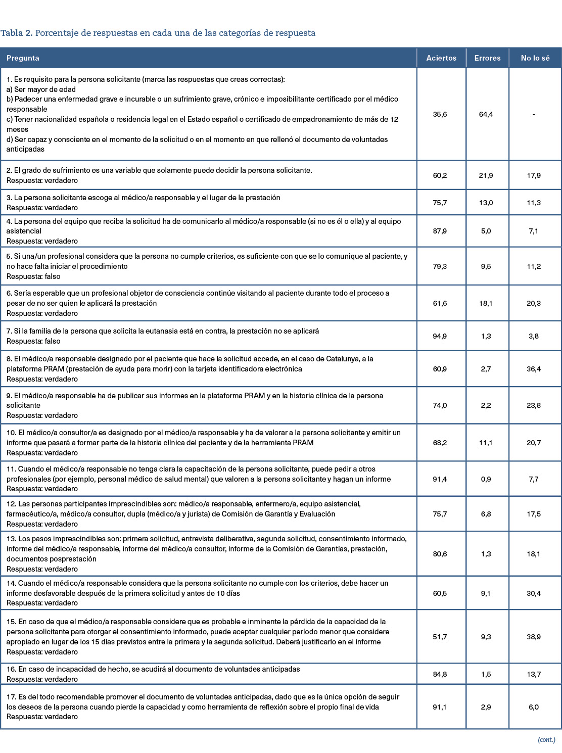 En cuanto al conocimiento sobre la ley de eutanasia, 42,1% de las personas encuestadas obtuvo un 80% o más de aciertos en la evaluación. La pregunta con mayor porcentaje de aciertos (96,7%) fue sobre la posibilidad de revocar o aplazar el procedimiento en cualquier momento, mientras que la pregunta con menos aciertos fue sobre los requisitos del solicitante (tabla 2).