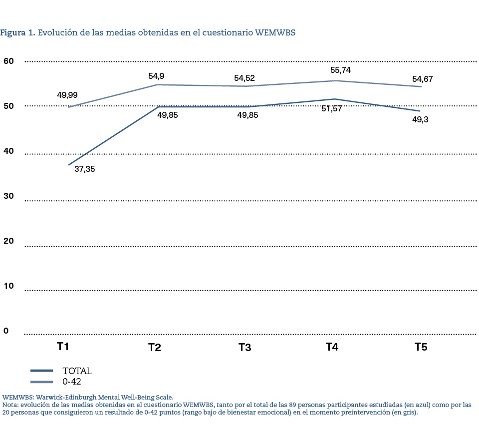 En el cuestionario WEMWBS, la diferencia entre las puntuaciones desde los 2 años y el momento basal fue estadísticamente significativa. Además, la diferencia supera los 3 puntos, lo que, según la Guía de WEMWBS, se puede interpretar como un aumento relevante16 (figura 1).