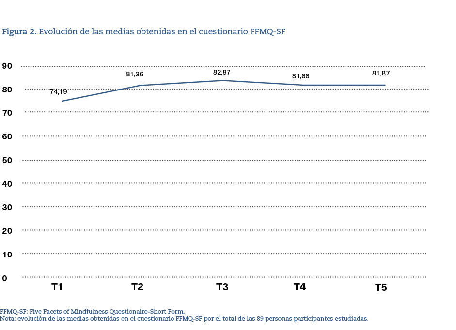 El tamaño del efecto medido por la d de Cohen, en el FFMQ total, entre el momento inicial y los 2 años fue de 0,66 (tamaño del efecto moderado-importante). En las facetas, el tamaño del efecto fue moderado en la mayoría de ellas, con especial relevancia en «ausencia de juicio», que se asocia con la ganancia de bienestar emocional19.