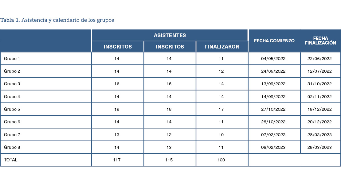 Mediante cartelería en el consultorio y en las consultas de Medicina de Familia y Enfermería, se invitó a las personas mayores de 20 años residentes en Ribafrecha (localidad riojana de 1.025 habitantes, de los cuales 830 son mayores de edad) a participar en un programa de bienestar emocional basado en atención plena, basado en un curso de MBCT de 8 semanas. El curso fue impartido por el médico de familia de la localidad. Lo iniciaron 117 personas, y fueron 100 las que finalizaron el programa (tabla 1).