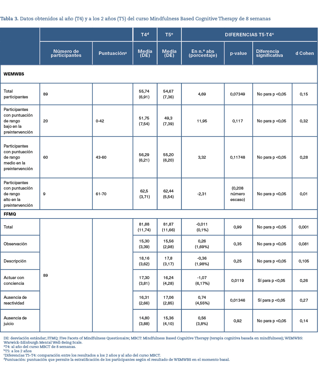 Los resultados muestran que las diferencias fueron estadísticamente significativas entre las medidas obtenidas en ambos cuestionarios (WEMWBS y FFMQ-SF) a los 2 años de finalizar el curso MBCT de 8 semanas, en comparación con los obtenidos en el momento preintervención (tabla 2).