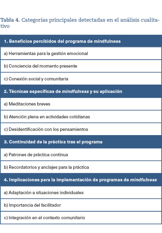 Tras los procesos citados, se obtuvo un listado de las categorías principales identificadas, divididas en cuatro apartados: beneficios percibidos del programa de mindfulness, técnicas específicas de mindfulness y su aplicación, continuidad de la práctica tras el programa, y las implicaciones para la implementación de programas de mindfulness (tabla 4):