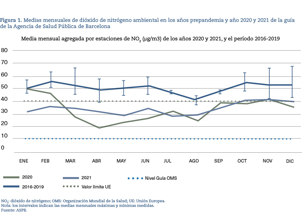 En Barcelona, la Agencia de Salud Pública (ASPB) registra la calidad del aire mediante estaciones de medición. Durante 2021, las restricciones por la pandemia de la COVID-19 mejoraron la calidad del aire respecto a los años prepandemia (2016-2019) (figura 1). El Distrito del Eixample mostró niveles anuales de NO2 de 38 µg/m3 en 2021, por encima de la recomendación de la OMS (10 µg/m3), pero por debajo del límite legal europeo (40 µg/m3), mientras que la exposición alcanzó los 59 µg/m3 en 20174.