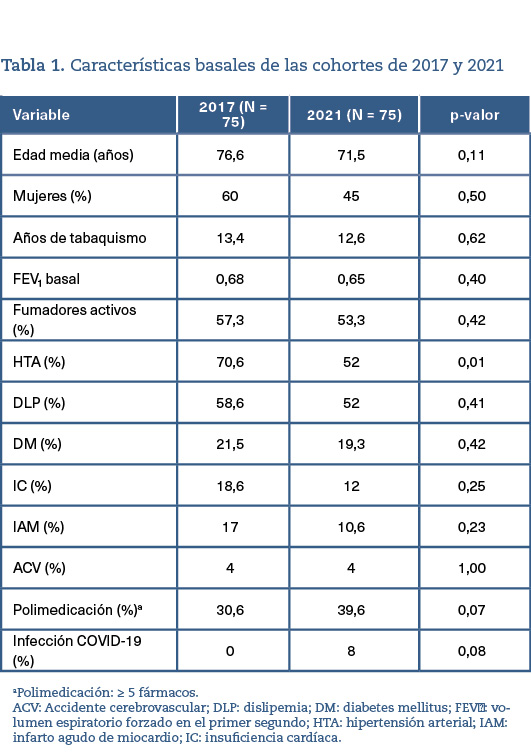 La edad media de los pacientes fue de 76,6 años en 2017 y de 71,5 años en 2021, con un ligero predominio femenino en ambos grupos (60% en 2017 y 55% en 2021). No se observaron diferencias estadísticamente significativas en los años de tabaquismo activo (13,4 años en 2017 vs. 12,6 años en 2021) ni en la función pulmonar basal medida por el FEV₁ (0,68 en 2017 vs. 0,65 en 2021).