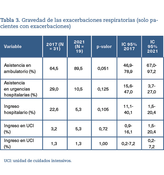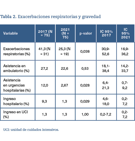 En cuanto a las exacerbaciones respiratorias, se observó una incidencia significativamente mayor en 2017 (41,3%, IC 95%: 30,9-52,6% vs. 25,3%, IC 95%: 16,9-36,2%; p = 0,038). Además, la gravedad de estas exacerbaciones fue más pronunciada en 2017, con un mayor porcentaje de visitas a urgencias (12,0%, IC 95%: 6,4-21,3% vs. 2,67%, IC 95%: 0,7-9,2%; p = 0,028) y hospitalizaciones (9,3%, IC 95%: 4,6-18,0% vs. 1,3%, IC 95%: 0,2-7,2%; p = 0,029) (tabla 2). En el análisis concreto de los pacientes que presentaron exacerbaciones respiratorias, se observó que en 2021 la mayoría fueron atendidos en el ámbito ambulatorio (89,5% vs. 64,5% en 2017, p = 0,051), mientras que en 2017 hubo una mayor proporción de visitas a urgencias (29% vs. 10,5%, p = 0,125) e ingresos hospitalarios (22,6% vs. 5,3%, p = 0,105) (tabla 3).