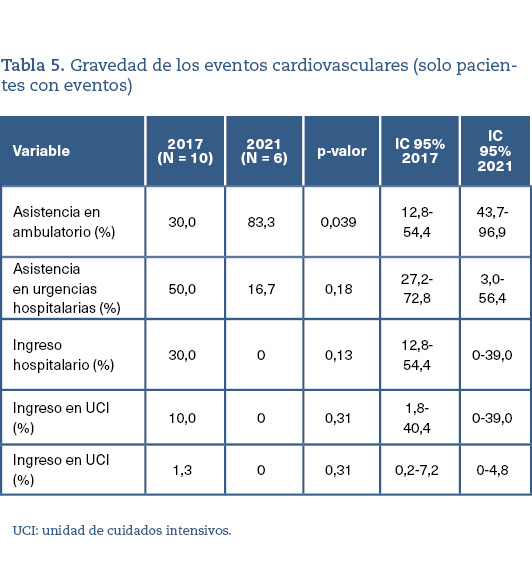 Respecto a los eventos cardiovasculares, no se encontraron diferencias significativas en la incidencia entre ambos años (13,3%, IC 95%: 7,4-22,8% en 2017 vs. 8,0%, IC 95%: 3,7-16,4% en 2021; p = 0,29) (tabla 4). Sin embargo, al centrarnos en los pacientes que presentaron eventos cardiovasculares y analizar la gravedad de estos, se observó que en 2021, en comparación con 2017, la mayoría de pacientes fueron atendidos en el ámbito ambulatorio (83,3% vs. 30%, p = 0,039), mientras que en 2017, en comparación con 2021, hubo una mayor proporción de visitas a urgencias (50% vs. 16,7%, p = 0,18) e ingresos hospitalarios (30% vs. 0%, p = 0,13) (tabla 5).