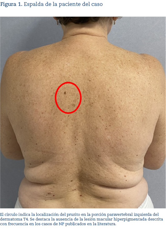 Dos tercios de los casos publicados en la literatura describen una mácula hiperpigmentada en la zona afectada1, posiblemente resultado del rascado crónico o de la liberación de sustancia P en la piel, generando proliferación de queratinocitos, fibroblastos y células musculares lisas6. Si bien es una lesión representativa de NP, no es necesaria para realizar el diagnóstico7,2, de hecho, la paciente del caso no presentaba dicha lesión cutánea en la región dorsal.